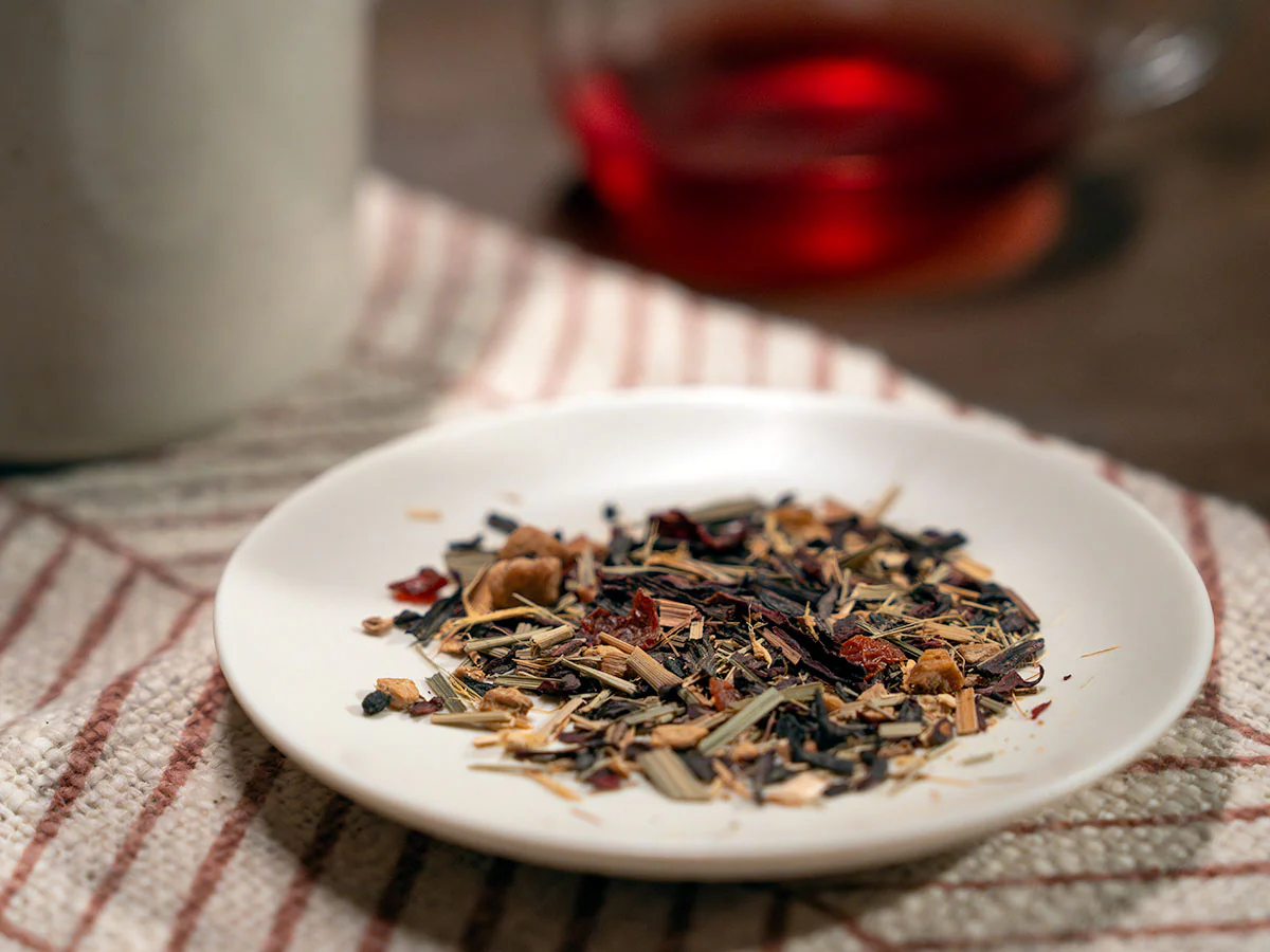 Organic: hibiscus, rosehips, ginger, licorice root, lemongrass, dried apple, elderberries, cold pressed orange oil